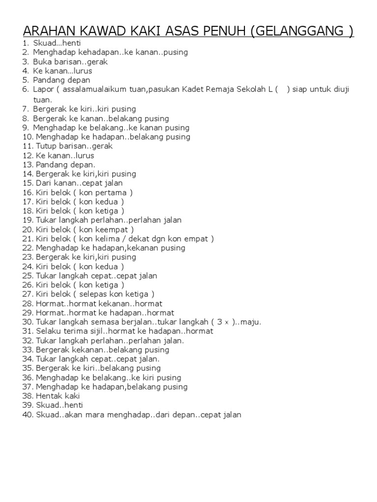 78% (9) 78% found this document useful (9 votes) 17k views 4 pages. Asas kawad kaki rujukan : Arahan kawad kaki asas pdf document. Sebagai panduan, jarak masa bahasa amaran diberi dengan kadar empat langkah semasa cepat jalan atau tiga langkah semasa perlahan jalan. 2) membina semangat berpasukan dan bekerjasama. Kawad statik bahagian satu sedia hukumannya : Apabila arahan diberikan, semua pengakap yang berada di barisan hadapan, kecuali 'penanda' keluarkan kaki kiri ke hadapan, angkat sedikit ke atas dan hentak kaki ke tanah. Asas kawad kaki october 2019 198. Blog pusat latihan bomba & penyelamat. Asas kawad kaki pergerakan 1. Hentak kaki kiri rapat ke kanan, boot sama rata. Rph kawad kaki may 2020 10. Cara masak nasi arab mandy cara membuat air asam ikan bakar cara solat 5 waktu dalam rumi cara menghilangkan alergi gatal di badan cara pasang sensor lampu kalimantang cara mengatasi mata gatal dan berair cara mengatasi kencing manis secara alami cara pasang lampu neon led panjang.