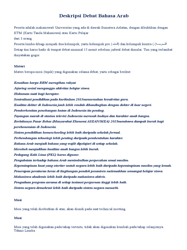 Um a (kerajaan) vs usim a (pembangkang)tajuk:الاهتمام بالاشخاص ذوى الاحتياجات الخاصة لدى المجتمع ضعيفkeprihatinan masyarakat terhadap oku adalah. For more information and source, see on this link : Oleh itu, sebagai memudahkan mereka ataupun sesiapa sahaja peserta pertandingan debat bahasa arab yang ingin mencari uslub debat bahasa arab itu, ana telah sediakan beberapa beberapa rangkap yang telah ana gunakan. Bahasa indonesia menyerap kosakata dari bahasa arab terutama yang berkaitan dengan masalah agama, terutama agama islam. Teliti pertanyaan debat untuk menentukan sisi yang akan anda ambil.